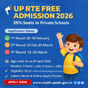 UP RTE Admission 2026 – The Government of Uttar Pradesh has released the UP RTE Free Admission Notification 2026 under the Right to Education (RTE) Act, 2009.Under this scheme, 25% seats in recognized private unaided schools are reserved for children from Economically Weaker Sections (EWS) and Disadvantaged Groups (DG) for the academic session 2026–27.